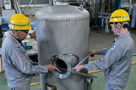 筒体和封头的尺寸精度对密封性和气密性有较大影响,精度低时会造成焊接接头嵌合不良。特别是通过焊接组装的容器主体和法兰,焊接位置会因为热而发生变形,无法按照设计图纸完成。因此,必须测量制作完成的压力容器的尺寸,确认在容许范围内。