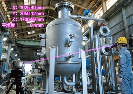 这些设备均使用大型压力容器,因此除了难以准确测量尺寸之外,还必须由多人进行测量,花费大量工时。提升效率成为当务之急,另一方面,为了维持安全性,对于提升测量精度的要求也更急迫。