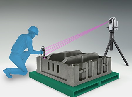 然而,实施测量作业时必须将大型真空室从生产现场搬运至测量室,安装在测量仪上进行测量,需要花费大量工时。此外,还存在想要测量时无法在现场立刻测量的问题。测量超过1 m的大型真空室时,还存在以下难题:测量人员必须具备高水平的测量技能,或需要2至3人合作测量。