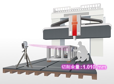 此外,以安装在加工机上的状态进行测量时,存在许多问题,如无法用手动工具准确测量三坐标尺寸、耗费大量工时导致加工机运转率下降等。而且,在一边确认完成精度一边实施进一步加工时,从加工机拆下后再测量的方式并不理想,希望能在安装于加工机的状态下进行尺寸测量。因此,在测量大型真空室的尺寸时,理想的三坐标测量仪应该紧凑不占地且可以自由移动,并在加工机上实施大范围测量。