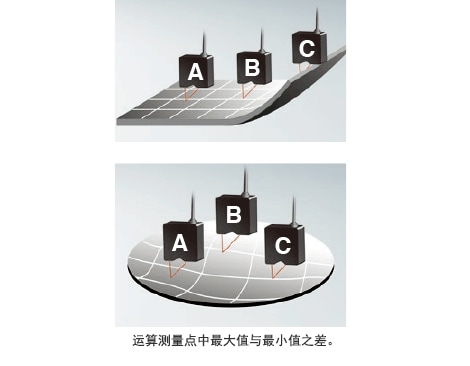 通过安装多台传感头并运算各自的高度数据,来测量变形、平面度。