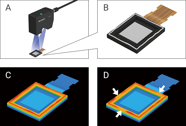 此外,对于部件封装这种具有纵向深度的工件,也能从上方通过单次拍摄测量面(区域)的高度,不会出现“点”式测量移位计存在的因反射光阻断,即“死角”引发的不可测量区域。