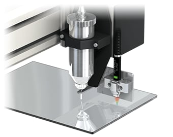 通过让彩色激光同轴位移计“CL-3000系列”与点胶机喷嘴同步运行,对工件的高度进行实时测量及反馈,实现喷嘴的高度控制。由于