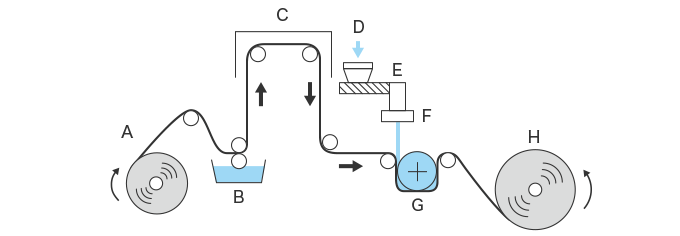 应用树脂成型方法之一的“挤压成型”的粘合技术,也被称为“Extrusion laminating”。对于已涂布(锚定涂层)粘合辅助材的基材,用狭缝状的模具(T形模具)将加热溶解后的材料抹开,形成薄而平坦的涂膜,实现基材涂布。通过用冷却辊压接、固化材料,将材料与基材贴合在一起。