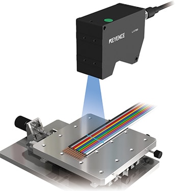 使用2D位移传感器测量带状电缆的截面形状和宽度。可不受目标物材质的影响,进行稳定测量。测量导线排列状态是否正确、宽度是否合适等。