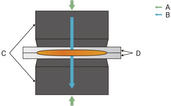 分为“摩擦压接法”、“气体压接法”和“电阻点焊接”。“摩擦压接法”利用的是物质的塑性,即向物质施加一定的力并使其发生变形后,即使不再用力,也会保持变形的性质;“气体压接法”是通过将母材相互压紧,再用气体加热以实现接合;“电阻点焊接”则是将待接合的2块母材相互重叠并通电,将电阻发热作为热源以进行接合。