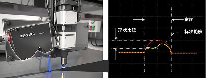 例如,在拼焊(TB)的激光焊接工序中导入“LJ-X8000系列”,可在不增加单件作业时间的前提下,追踪机器人的焊炬,在焊接后立即稳定地对焊道进行形状检测。利用最快64 kHz采样,即使在自动焊接时扫描头随焊炬快速并行移动,也可实现稳定的形状检测,可立即检测出焊接缺陷,将发生不良的可能性降低。
