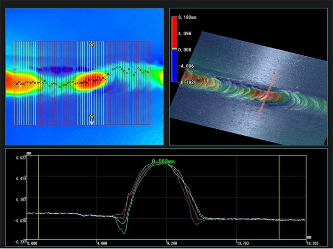 利用超高速轮廓测量仪“LJ-X8000系列”检测到的2D截面形状数据,生成3D形状并进行分析,实现精密的形状检测。