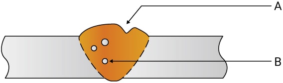 焊接金属内部产生的气孔,在释放到焊道表面时,形成空洞并凝固的表面缺陷,被称为“凹痕(开口缺陷)”。另一方面,留在焊道内部的气孔,则是被称为“气孔”的内部缺陷。导致上述两种缺陷的原因,可能是保护气体不良或脱氧剂不足、母材坡口面的油分、锈蚀、镀层等表面附着剂、材料含水量等。