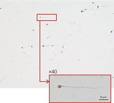 使用基恩士的一体化荧光显微成像系统BZ-X,能够将通过圣诞树染色法染成红色的头部作为目标,瞬间检测出图像内的精子,并计算相应的数量。还能对整块载玻片进行自动连续拍摄。