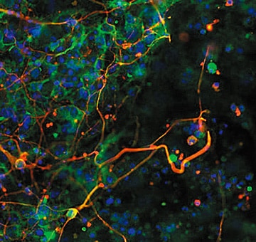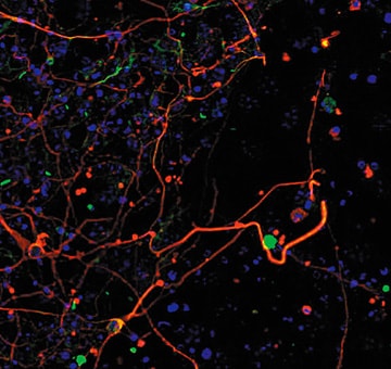 神经细胞由于结构复杂,在进行荧光观察上容易受荧光模糊的影响,需要使用激光共聚焦显微镜进行观察。通过切片拍摄,可去除绿色神经肽的荧光模糊进行观察,实现左边的图像那样的效果。