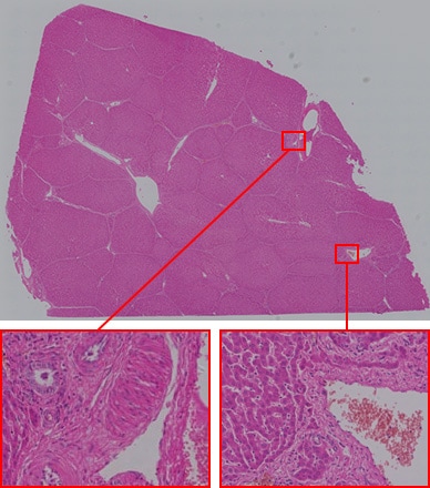 - 针对无法完整进入视野的大切片,一边移动载物台一边获取图像,将拍摄的图像拼接起来,即可合成1张高分辨率图像。