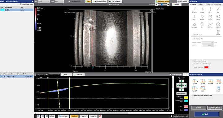 对于扫描后的3D形状数据,可在电脑画面上使用工具,在各位置准确描画垂直的轮廓线,因此测量结果不会产生偏差。