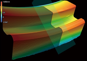 不同于接触式测量仪,“VR系列"可准确测量各种形状的留余,无需耗费大量时间和精力。此外,只要扫描过一次工件,即可测量与过去测量时不同位置的轮廓(截面形状)。无需特意再次准备相同个体重新测量。此外,还可以利用数据,对批次、加工条件、材料等不同的相同形状工件轻松进行差分检查。