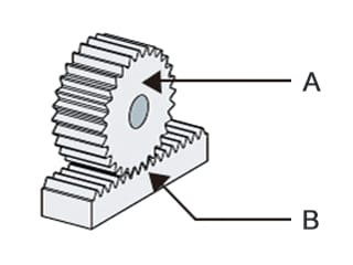 齿条是指板状或棒状的齿轮(B部件),齿轮是指小型的圆柱状齿轮(A部件)。将齿条和齿轮组合起来的齿轮机构称为“齿条与齿轮”。它可以将旋转运动转换为直线运动,被用于汽车的转向机构、输送装置和机床等。