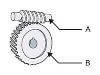 由带螺纹的轴“蜗杆”(A部件)和与之相配的蜗轮(B部件)组成的齿轮机构称为“蜗轮蜗杆”。蜗轮蜗杆被归类为交错轴齿轮,多为交错角90°。此外,由于减速比大,常用于需要在转换旋转方向的同时获得大减速比的场合。