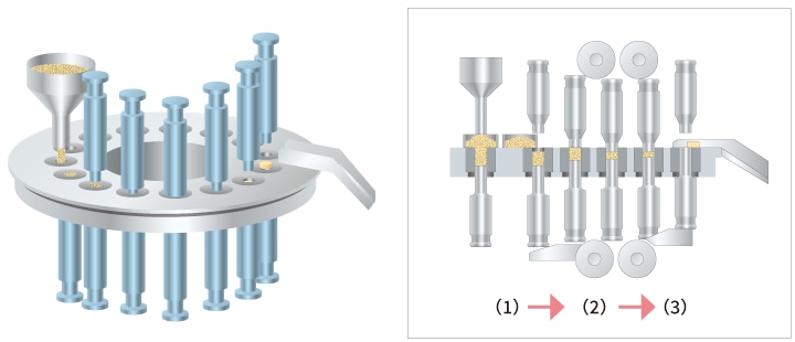 我们通常将旋转式成型机称为制药片机。这是制造药片所需的一种冲压机。自动称量粉末状药剂后放入作为固定模具的金属模具的孔中,然后通过被称为凸模的金属模具在上下方向上加压,由此制作药片形状的机械。这个机器连续进行“填充”、“压缩”、“排出”的动作。