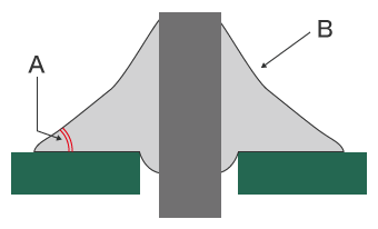 一般情况下,会确认和评估在与焊盘的接合部分熔融并固化的焊锡形状(焊点)。其形状是如同富士山一般具有平滑、凹状的曲线,并于山脚处扩展开。接触角θ越小(润湿性高),状态越好,之后会结合图示进行说明。