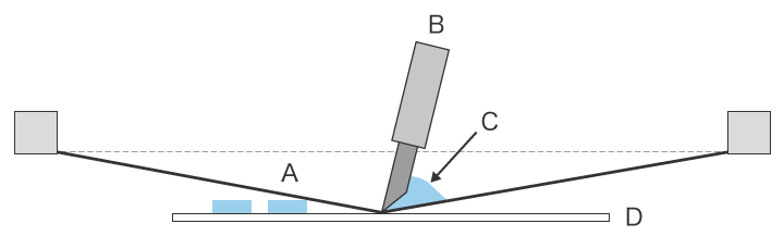 润湿性可用固体表面与滴落在其上的液体(熔化状态的焊锡等)之间的“接触角θ(Contact Angle)”大小来表示。图中的角度A(接触角θ)越小,润湿性越高,代表液体与固体表面之间的涂布结合性越好。接触角越大,固体表面与液体的结合性越差,润湿性也更低。