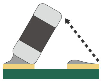 此外,在回流焊工序中,熔融的焊锡会使端子电极受到表面张力。此时,若两个端子焊锡量有差异,或加热温度有偏差,两个端子上的表面张力会产生差异,出现芯片立起的现象。这种现象可比作高层大厦,称为“曼哈顿现象”,或比作墓碑,称为“立碑现象”。