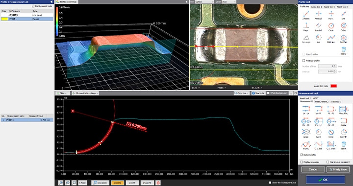利用彩色图显示高度,可使焊点和电子部件的形状可视化,帮助测量人员迅速了解异常位置及其详细值。