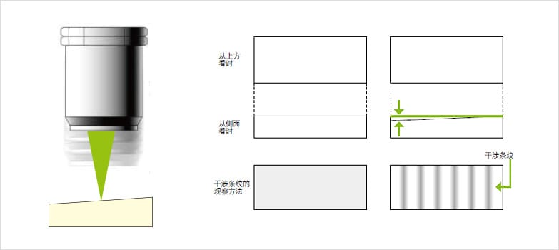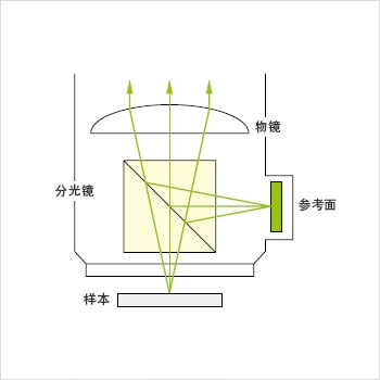 事先将CCD元件与参考面间的光学距离(光路)和CCD元件与样本表面的光学距离设为等长,在CCD元件上形成的影像将反映出因样本表面凹凸导致的光路差而产生的干涉条纹。计数该干涉条纹的条数,可读取样本表面的凹凸(高度)。