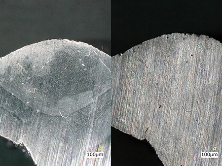 焊接部截面的尺寸测量是关乎强度和品质的重要检测。可是,若使用立体显微镜,母材和焊珠的对比度较低,难以判断测量位置。此外还需要通过目视与刻度进行对比,手动输入该数值,因此会出现人为误差,作业也更加复杂。