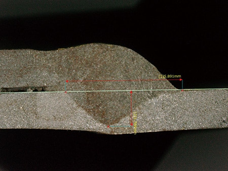 因此,通过测量焊接后焊珠截面的大小“喉厚(喉部截面)”、“脚长”、“熔深”等检测基于强度设计的焊接品质十分重要。焊接部的品质可以通过宏观测量焊接后的截面来评估。