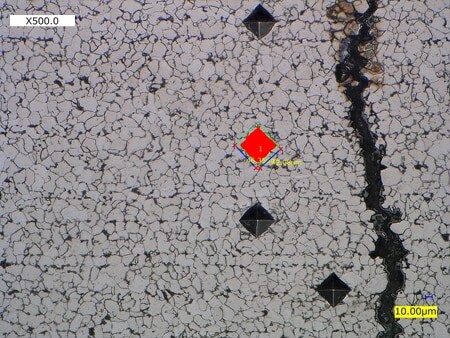 并测量留下的维氏压痕的对角线长度,来进行计算。