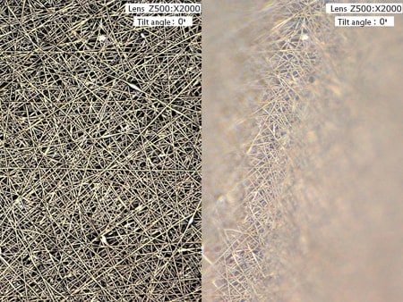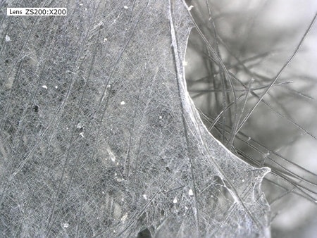 纳米纤维是直径小于100 nm的超极细纤维。将纤维缩小为纳米级,可附加全新的功能,如抗菌性、超微粒子捕集性、滑流效应(提升通气性)等。下面我们将为您介绍使用数码显微系统观察纳米纤维的案例。