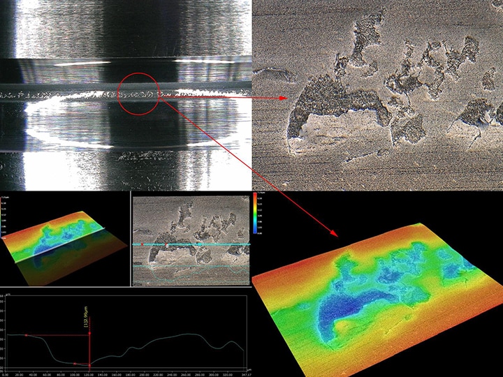4K数码显微系统“VHX系列”不仅能够清晰地放大观察,还能实现难以进行的各类计算及测量,并获得相应的数值。只需用鼠标简单操作1台设备,就能观察磨损试验后的滑动面剥离*、点蚀*等损伤,实施有助于开展粗糙度检测的平面测量及粗糙度测量。