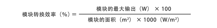 模块转换效率一般用作表示太阳能电池模块(太阳能电池面板)发电能力的指标。模块转换效率是指表示太阳能电池模块的每1 ㎡可将约1 kW的光能转换为电能比例的百分比形式的数值,可用以下计算公式求出。
