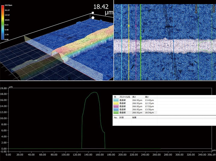 用4K数码显微系统“VHX系列”可直接从高精细的放大图像中测量出次微米级的3D形状。色差图可将高度数据可视化,同时可测量多个指定位置的轮廓,因此可简单地对比各部位的细微形状。