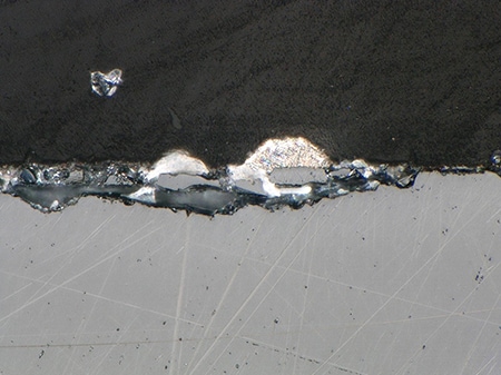 传统显微镜在以高倍率放大树脂包埋并研磨过观察面的截面样品时,如果样品表面仍然留有少量凹凸,则无法在整体对焦的状态下清晰观察*。如果采用扫描电子显微镜(SEM),需要将样品室变成真空或低真空状态,这种抽真空等事先准备工作需要花费时间和精力,而且无法通过彩色图像进行观察,因此很难辨识同时存在于截面内的材质变化和异物。
