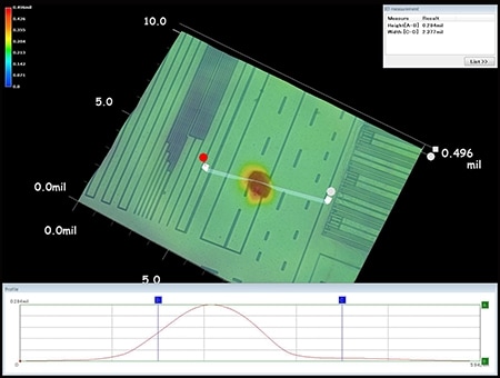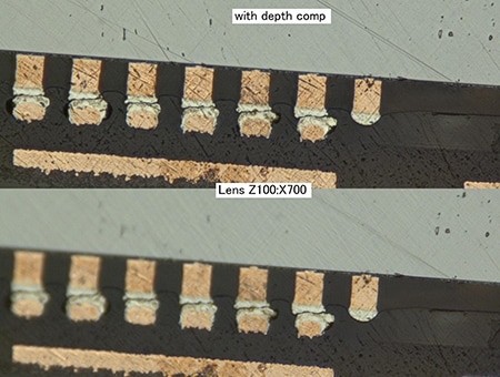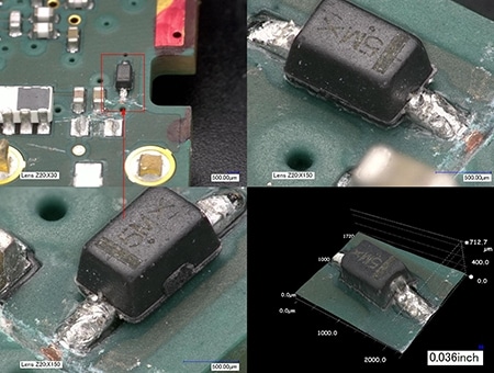 4K数码显微系统“VHX系列”对于细小异物也能拍摄高倍率的清晰图像。还能用少量图像构建立体影像,分辨异物和凹陷造成的凹凸,判断电路表面是否有异物存在。