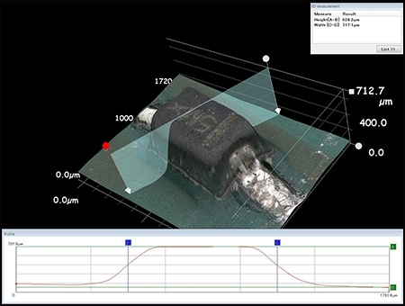 “VHX系列”甚至能直接运用高度信息,对异物的3D形状及轮廓进行测量。仅用1台设备就能快速根据异物的大小、结构、体积进行定量评估,并用拍摄到的图像和测量值创建报告。