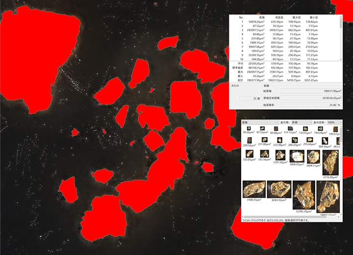 “VHX系列”还可根据观察结果无缝地执行结晶粒度分析。“自动面积测量、计数”功能可用简单操作指定范围,并在该范围内以期望阈值进行二值化处理。可自动执行晶体的面积测量、计数。
