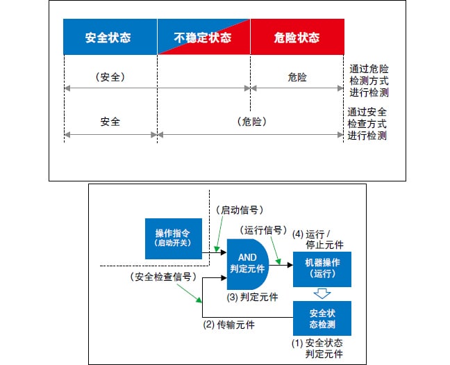 - 此类系统只在确认安全后才允许运行机器,是构建明确安全条件的一种方法。详细地说就是,只有当系统检测到用户不