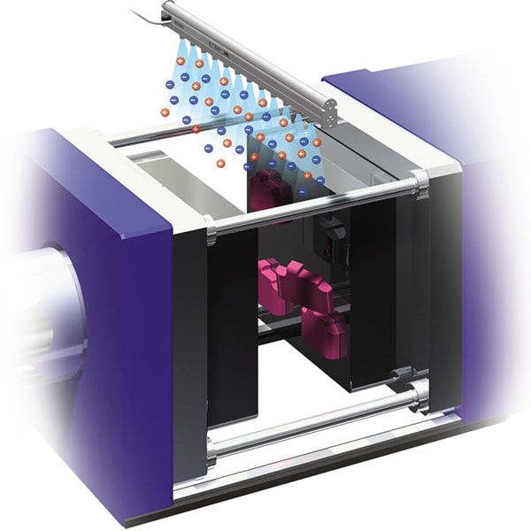 模制品非常容易产生静电,静电可能导致部件贴附在模具上。这会增加产品从模具中脱落并废弃的成本,以及作业人员将其从模具中取出要花费的工时。可使用静电消除器防止模具残留。