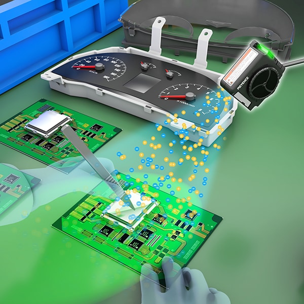 在单元工序中处理电子印刷电路板时,静电会伴随着剥离和摩擦动作而产生。即便采取接地、导电化等对策,在剥离部件或腾空作业等时,仅采取这些对策效果并不充分。可使用静电消除器加强静电对策效果。