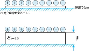例如,厚度d[m]的绝缘体薄膜(相对介电常数)紧贴着已接地的导体板,薄膜表面存在Q[C/m2]的电荷时。