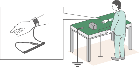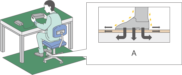 - 通过在桌上或地面铺上垫子,消除了作业人员与工作台的静电。