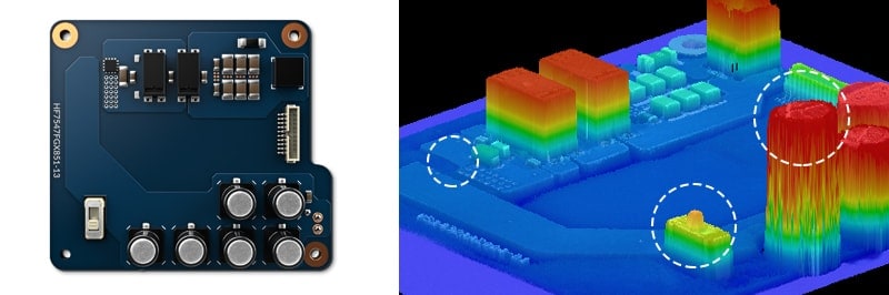 快速投影多张条纹图案。超高速拍摄 CMOS 传感器和高速处理器实时分析来自于工件的反射光,生成 3D 图像。
