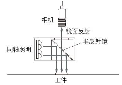 同轴光源从侧面将光线发射到半反射镜上,反射镜再将光线反射到工件上。镜面反射光可以返回到相机,而工件表面如刻印伤痕等凹凸不平的部分产生的漫反射光则不能接受到。这样就使得工件的边缘点形成了对比度。而且,来自工件的光线越远,不能接受到的漫反射光就越多,形成更大的图像对比度和清晰度。