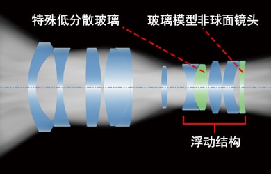 实现了支持 4/3 型相机芯片的同时实现了 0.05% 的低 TV 失真(CA-LAE16)。此外,还实现了从近距离 0.07 m(CA-LAE12)到无限远的大范围内降低像差。