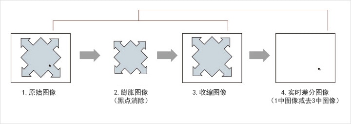 为了在视觉系统中正确再现人眼观察到的图像,拍摄清晰图像很重要,但根据不同检测目的,有时不需再现人眼观察到的图像,还可能通过强调特点(膨胀/收缩等)、通过模糊处理减少干扰成分(平均化/中值等)而得出更佳检测结果。