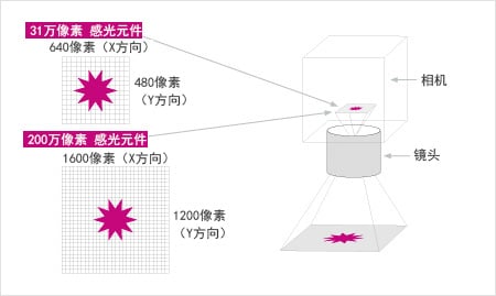 例如,假设使用了31万像素和200万像素的相机。31万像素的Y方向像素数为480像素,200万像素则为1200像素。
