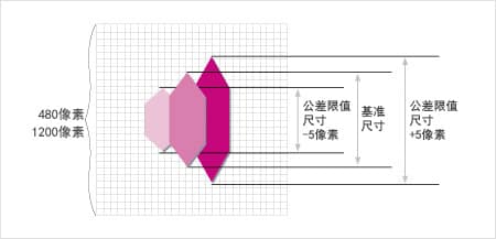 尺寸检测中,公差被作为辨别良品和不良品的阈值,通常以±5像素为基准进行计算。该公式中,将可以作为公差进行稳定判定的像素数,当作重复精度的10倍左右,视觉系统的理想条件约为0.1像素,为了留有余地,将重复精度假设为0.5像素。将该重复精度的10倍——±5像素作为能够设定为公差的最小估算值,就可以通过以下公式,求出实际尺寸值。