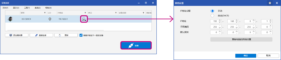 点击图标,会显示[网络设置]对话框,可变更在列表行中选择的设备的网络设置。设置更改完成后,选择〔连接〕。