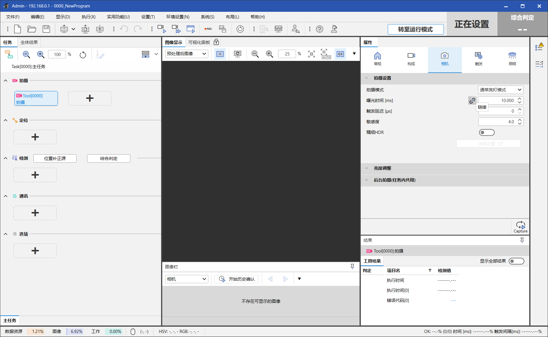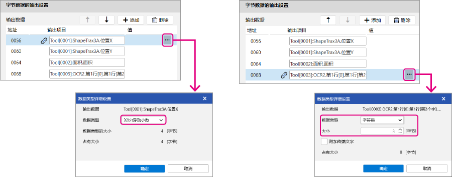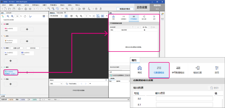 在此进行设置,以输出“面积工具判定(True=OK)”、 “OCR2 工具判定(True=OK)”。拖放至地址的输出 项目的位置。
